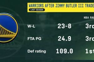 巴特勒加盟后 勇士防守效率联盟第一!战绩&罚球联盟第三